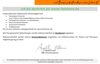 Ich habe eine fundierte Ausbildung mit Diplom-Abschluss absolviert, jahrelange Erfahrung in renommierten Reha-Kliniken im In- und Ausland gesammlt und viele lehrreiche Schulungen besucht, bevor ich mir 2012 den Traum verwirklichte, meine eigene Praxis zu eröffnen. Hier ordiniere ich als Wahltherapeutin aller Kassen – Sie können also mit einer von der zuständigen Kasse bewilligten ärztlichen Verordnung zu mir kommen. Meine Praxis ist selbstverständlich barrierefrei erreichbar, in Sonderfällen biete ich auch Hausbesuche an.